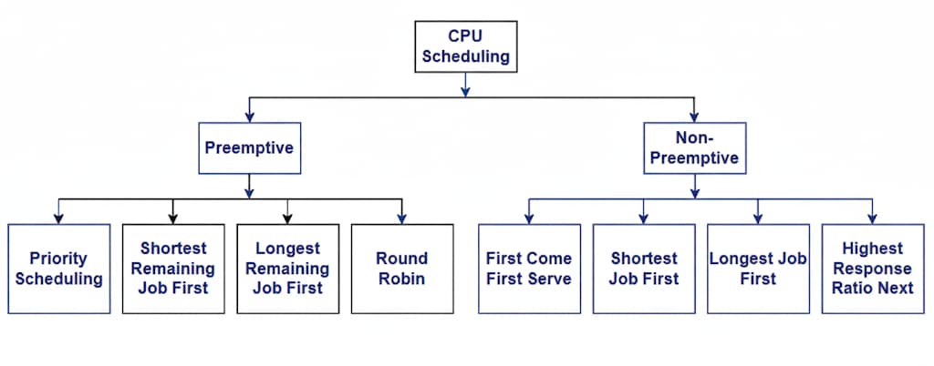 - Throughput: The number of processes completed per unit time. If 10 processes finish in 1 second, throughput = 10 processes/sec.
