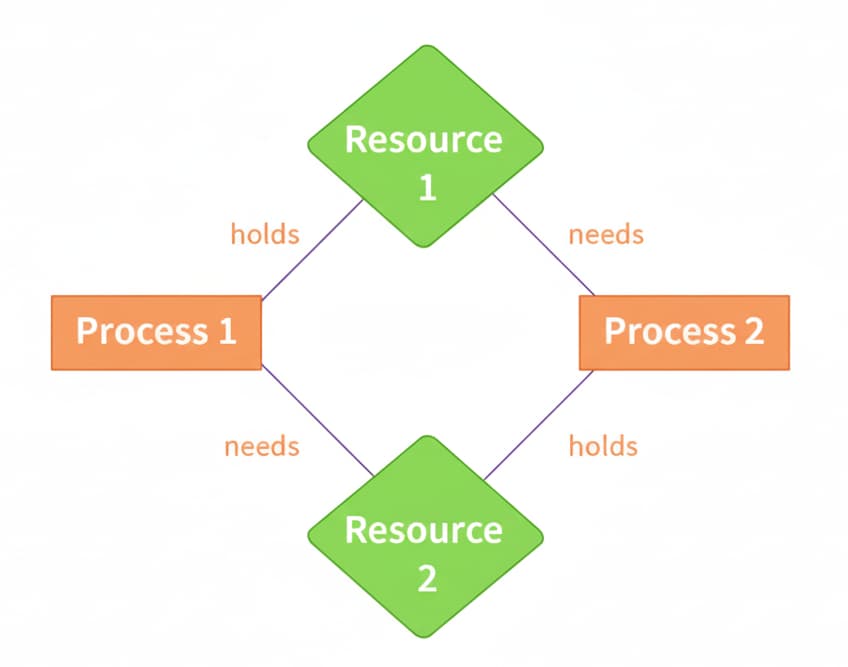 - No Preemption: A resource cannot be forcibly taken; it must be released voluntarily.