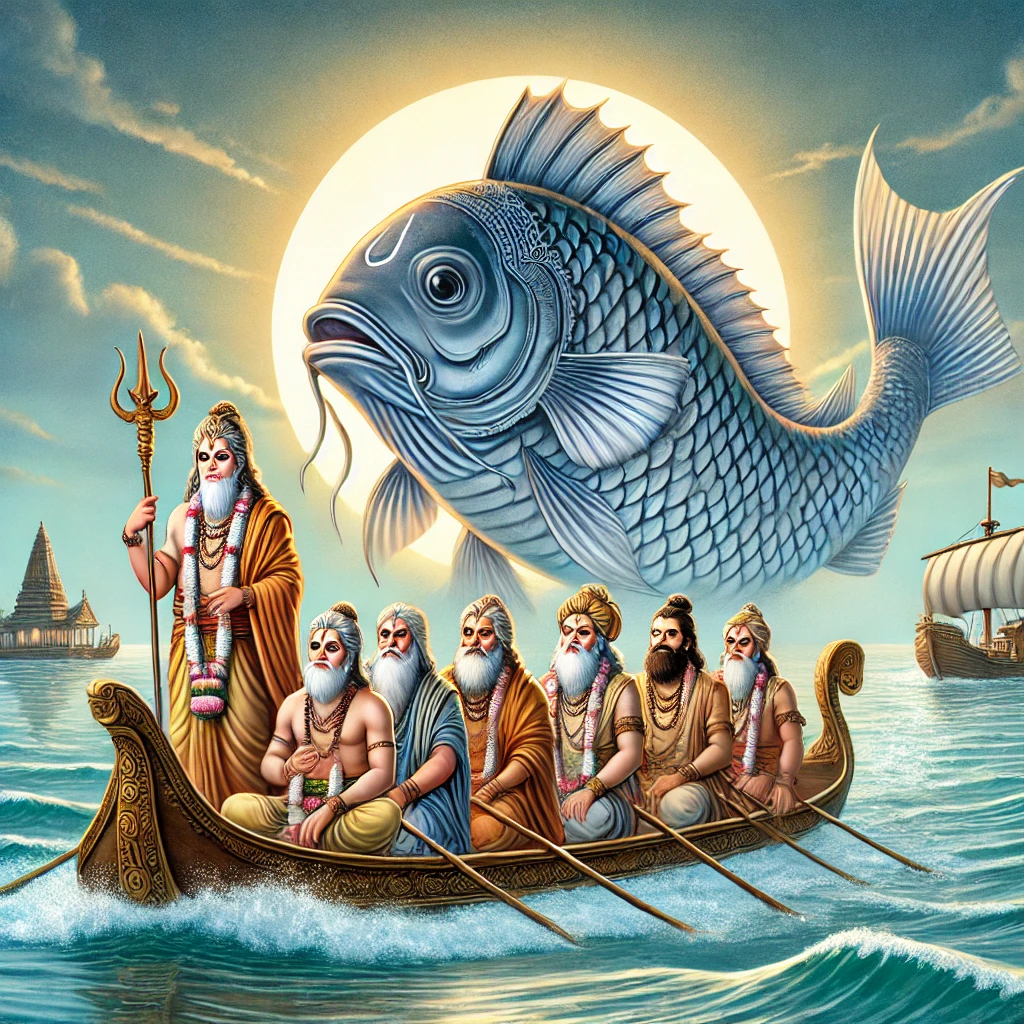 इसके बाद कुछ समय बीत जाने के बाद (प्रलय काल शुरू होने के 7 दिन पहले), एक दिन कृतमाला नदी में पितृ-तर्पण करते हुए महाराज मनु की हथेलीपर जलके साथ ही एक मछली आ गयी तब राजा उस मछली को वापस जल में डालने लगे तब बह छोटी सी मछली बहुत कातर भाव से मुनि से बोली- हे दीनवत्सल राजन् ! मैं छोटी सी मछली हूँ इस नदी की बड़ी मछलियाँ मुझे खा लेगी, मुझे बहुत डर लग रहा है। आप मेरी रक्षा कीजिये। मछली की इस प्रकार कातरोक्ति सुनकर राजा उसे अपने कमण्डलु में डालकर अपने आश्रम में ले आये। एक ही दिन रात में वह मत्स्यरूपसे सोलह अङ्गुल बड़ा हो गया और 'रक्षा कीजिये, रक्षा कीजिये' यों कहने लगा। तब राजाने उस जलचारी जीवको मिट्टीके एक बड़े घड़े में डाल दिया। वहाँ भी वह एक (ही) रातमें तीन हाथ बढ़ गया। पुनः उस मत्स्य ने सूर्यपुत्र मनु से आर्तवाणी में कहा- 'राजन् ! मैं आपकी शरणमें हूँ; मेरी रक्षा कीजिये, रक्षा कीजिये।' तदनन्तर उन सूर्य नन्दन (वैवस्वत मनु) ने उस मत्स्यको कुएँ में रख दिया, परंतु जब वह मत्स्य उस कुएँ में भी न आ सका, तब राजाने उसे सरोवरमें डाल दिया। वहाँ वह पुनः एक योजन बड़े आकार का हो गया और दीन होकर कहने लगा- 'नृपश्रेष्ठ! मेरी रक्षा कीजिये, रक्षा कीजिये। तत्पश्चात् मनुने उसे गङ्गा में छोड़ दिया। जब उसने वहाँ और भी विशाल रूप धारण कर लिया, तब भूपाल ने उसे समुद्रमें डाल दिया। जब उस मत्स्य ने सम्पूर्ण समुद्र को आच्छादित कर लिया, तब मनुने भयभीत होकर उससे पूछा-